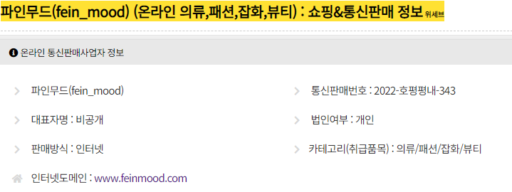 인터넷 서칭을 해보니까 삐루빼료 쇼핑몰의 운영은 누나가 한다기 보다는 동생 최장혁이 하고 있는 것 같더라구요. 삐루빼료 쇼핑몰 이름은 파인무드라고 하며 대표자명은 비공개로 되어있더라구요.